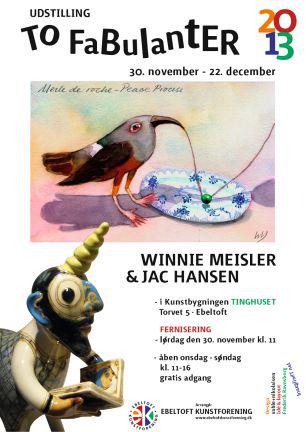 Oplev en sjov og meget anderledes juleudstilling. Maler og Grafiker Winnie Meisler og Keramiker Jac Hansen kalder deres udstilling "To Fabulanter" for at vise deres kærlighed til fantasien, som de begge arbejder med i deres værker. - Alle udstillede værker kan købes. - Der er fri entré.