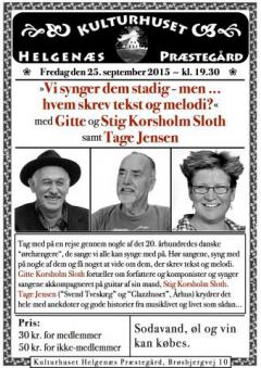 Koncert med Gitte og Stig Korsholm Sloth samt Tage Jensen. Hør sangene, syng med på nogle af dem og få mere at vide om hvem der skrev dem. Tag med på en rejse gennem nogle af det 20. århundredes danske "ørehængere", de sange vi alle kan synge med på. Hør sangene, syng med på nogle af dem og få noget at vide om dem, der skrev tekst og melodi. Gitte Korsholm Sloth fortæller om forfattere og komponister og synger sangene akkompagneret på guitar af sin mand, Stig Korsholm Sloth. Tage Jensen ("Svend Tveskæg" og "Glashuset", Århus) krydrer det hele med anekdoter og gode historier fra musiklivet og livet som sådan...