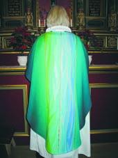 Sognepræst Lene Højholt ses her i Grenaa Kirkes nye, smukke messehagel, der blev præsenteret ved en festgudstjeneste i Grenaa Kirke i søndags. Hagelen er lavet af kunstner-parret Inge-Lise og Flemming Bau.