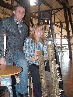 Øverst: Niels og Anne Nikolajsen forsikrer, at de velsmagende shii-take svampe på træstammerne kommer med på menuerne i restauranten i Stenvad Mosebrugscenter. Nederst: Anne og Niels Nikolajsen står foran deres nye arbejdsplads i restauranten på museet i Stenvad Mosebrugscenter. (Foto: Nørre Djurs Kommune)