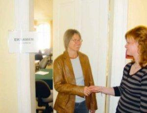 Lærer Anne Bøndergaard, og medforfatter til ti-punktsplanen, hilser på VUC-kursist Heidi Bager inden eksamen.
