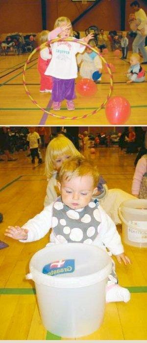 De 0-3-årige skulle dyste i forskellige discipliner, og det er nok ikke skudt helt forbi, hvis man gætter på, at der var en medalje til alle, idet »konkurrencerne« var slut. Og det er nok heller ikke helt forkert gættet, at de fleste af »OL-deltagerne« trængte til en gevaldig lur ovenpå anstrengelserne i Kulturhuset Pavillonens idrætshal, hvor disse billeder er taget. Men inden man kom så vidt skulle der selvfølgelig lidt indenbords af både fast og flydende. For uden mad og drikke, duer (sports)helten som bekendt ikke.
