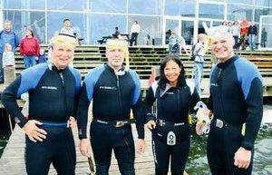 Indvielsen af Kattegatcentrets nye snorklingsaktivitet foregik med hjælp fra politikere fra Norddjurs’ kommunalbestyrelse. Fra venstre er det Kai Hansen, Benny Hammer, Pia Bjerregaard og Kattegatcentrets direktør Jørgen Lund Møller. De var alle pÃ¥ oplevelse i Kattegat i mandags.