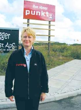 Det store Punkt1-skilt ved den nye, lysregulerede indkørsel til Rugvænget i Grenaa markerer, at Punkt1-butikken i Grenaa flytter fra Lillegade til Trekanten-området om et halvt års tid. Butikschef Susanne Hougaard og resten af Punkt1-personalet glæder sig selvsagt meget til at rykke ind i de nye lokaler.