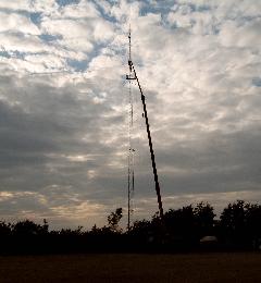 Fredag aften kom Jens med en kæmpekran til sportspadsen, hvor antennerne blev monteret. Den kunne næsten nå, men de sidste 8 meter måtte Jørgen kravle op over kurven og møjsommeligt sætte parabol til Pindstrup øverst, rundstråleantenne til Ryomgård på en tværpind nedenunder og kun boksen kunne nåes fra den mere sikre kurv.