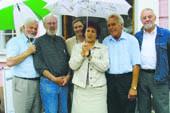 Fra venstre turistdirektør Per Rasmussen, guide Aksel Kondrup, formand for turistforeningen Alice Espeholt, museumsdirektør Brita Moslind, guide Niels Olsen og guide Erik Norrengaard. Guide Ole Olesen kunne ikke være til stede.