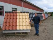 Langs den nye taghal på Nyhåbsvej i Kolind er der opstillet en udstilling, hvor Mikkel Christensen fra MC Tag ApS kan demonstrere de forskellige tagmuligheder for kunderne.