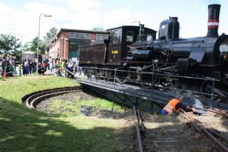 Damplokomotiv vendes på jernbanemuseets drejeskive.