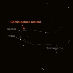 Stjerneskuddene kommer fra Geminiderne, som udstråler fra et punkt tæt på stjernerne Castor og Pollux.