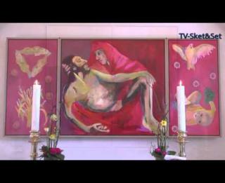 Trefløjet altertavle skabt af Lise Malinovski indviet påskedag 2016.