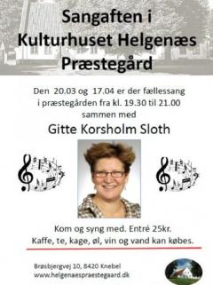 Den 20/03 og den 17/04 er der fællessang i præstegården fra kl. 19.30 til 21.00 sammen med Gitte Korsholm Sloth. Kom og syng med ! - Kaffe, te, kage, øl, vin og vand kan købes. Entré: 25 kr.