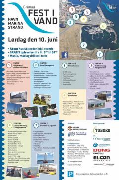 Grenaa FEST I VAND er en nyskabelse på Grenaa Havn. Foreninger, institutioner og virksomheder er gået sammen om at holde en Åbent Hus - på én og samme dag - nemlig lørdag 10. juni. Der er åbent fra 09.00-17.00 med aktiviteter og oplevelser boder og telte frem til 24.00. - Det er en aktivitetsdag, hvor arrangørerne opfordrer alle i regionen, børn, unge, ældre, familier, pensionister, handicappede og enlige, til at nyde alt det spændende, som vand indeholder. - Det gælder f.eks. at sejle, ro, kajak, havjagt, motorbåde, dykke, livredning, fange fisk og skaldyr, Redningsskibe, færge og besøge Dong Energy, Grenaa Havn, kunst, poesi og historie i bødehallen. - Desuden indgår en særlig aktivitet som Sklerose Foreningen står bag - Rap om Kap. Små plasticænder kastes i GrenÅen med købte lodder, og så er det strømmen, der afgør, hvem der vinder lodtrækningen. Og der er mange flotte gevinster. - På hele området er der boder og stande samt to store telte med musik. Der er mulighed for at spise ved at købe mad hos nogle af havnens restauratører. - Se mere om Grenaa FEST I VAND på Facebook.com.