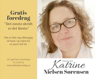 Hør foredrag om vanens magt, og vejen ud "Det næste skridt, er det første". Katrine Nielsen Sørensen fortæller om hendes misbrug som i mange år var mad. Alt handlede om MAD på den dårlige måde. Hør hvordan hun fik styr på sin vane, og lad dig inspirere til din nye vej. Enten for dig eller dén du holder af. - Katrine holder foredrag hos Liivs Terapi i Fjellerup. Hun siger: "Jeg vil her fortælle om en ungdom og et voksenliv i madens magt. Uanset hvad jeg foretog mig, så handlede mine tanker om mad ! - Hvis ikke det var hvad jeg skulle have at spise, så handlede det om hvad jeg ikke måtte spise eller en eller anden ny slankekur. - Om 3 dage er jeg færdig som vanecoach - så Jeg håber, at du har lyst til at komme og høre, hvad jeg har på hjerte - og hvordan jeg måske kan hjælpe dig til at få et afslappet forhold til din krop og din kost ...... Jeg vil også fortælle om en ganske særlig krukke med småkager fra mit barndomshjem :)" - Man skal tilmelde sig på mail til katrine@lykkelighverdag.nu. - Der er fri entré.