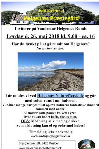 Har du tænkt på at gå rundt om Helgenæs ? - Nu er chancen her ! - Kulturhuset Helgenæs Præstegård inviterer igen i år på Vandretur Helgenæs Rundt. I år mødes man ved Helgenæs Naturefterskole og går med solen rundt om halvøen. Her er en god mulighed for at opleve naturens fantastiske skønhed sammen med andre. Der vil blive holdt mange gode pauser f.eks. ved Fyret, hvor man kan købe kaffe, the, is m.m. Medbring selv madpakke og drikkevarer. Som afslutning kan øl og sodavand købes. - Det er gratis at deltage og tilmelding er ikke nødvendig.