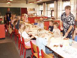 Her var sad hele 1. B solidt bænket omkring et stort bord næsten klar til at sætte tænderne i et par lækre pizzaer, som de sammen med fire forældre havde tilberedt i løbet af formiddagen.