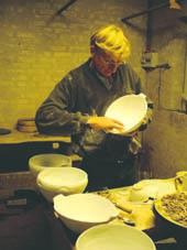 Han har haft værksted i Hyllested i 17 år. Den karakteristiske skorsten til een af ovnene stikker afslørende op mellem træerne, og ved vejen hænger et stort gult fad som vejviser.