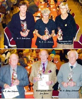 Samtidig benyttede man lejligheden til at kåre afdelingens bowlingmestre for 2007. I dame-rækken vandt Ilse Christiansen med 368 point foran Grethe V. Jensen (367) og Lis Andersen (359). I herre-rækken sejrede Jens Jensen med 397 point foran Erling Schneider (396) og Arne Schneider (384). De øvrige spillere på top 10-listen i begge rækker fik vin-præmier. Der blev hygget, snakket og sunget på livet løs, og på lodtrækningen på indgangsbilletterne var der 35, som var heldige at få en gevinst med hjem. Efter en hyggelig eftermiddag sluttede festen i god ro og orden. Lige nu råder der en velfortjent juleferie over afdelingen, men allerede fra og med den 7. januar kastes kuglerne igen for en ny sæson. Alle 8 baner i Grenaa Bowlingcenter er i øvrigt optaget af Ældre Sagen hver mandag mellem kl. 9.00 og 14.00, idet sæsonen skydes i gang.